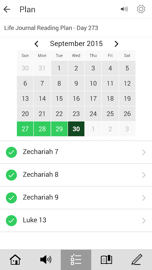 * Free Audio Bible: Click listen and you are instantly listening to the daily devotional plan. You can also look up any passage you want, the listen tab is in the bottom right hand corner at all times.