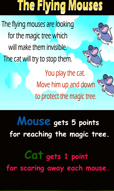 You play the cat who protects the magic tree. You get 1 point for each mouse you scare away.The mouse gets 5 points for reaching the magic tree and becoming invisible.