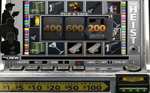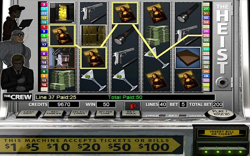 The Heist is a 4x5 slot machine, similar to many found on real casino floors. But this is no ordinary slot machine! At your disposal are three crew members waiting to help you pull off the ultimate caper. Build your team, then watch as they rack up huge winnings during the free spin bonus round. The tech wiz, safe-cracker and demolitions guy each know how to make your slot machine pay out in different and exciting ways. Watch them work together for huge jackpots!