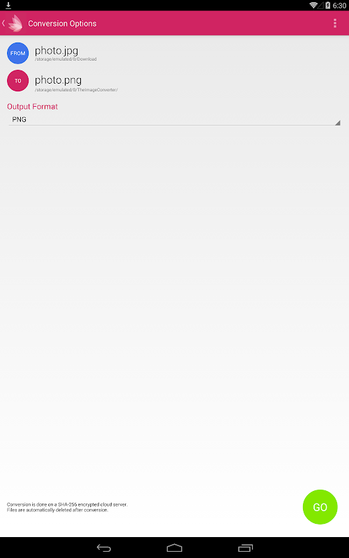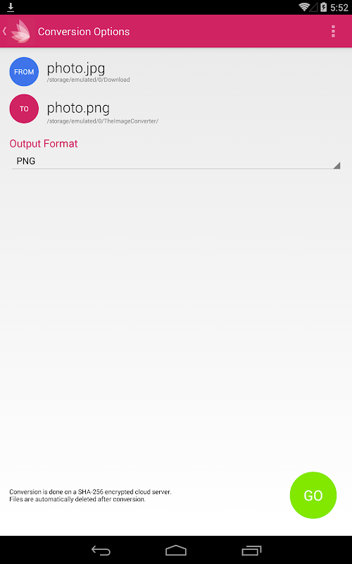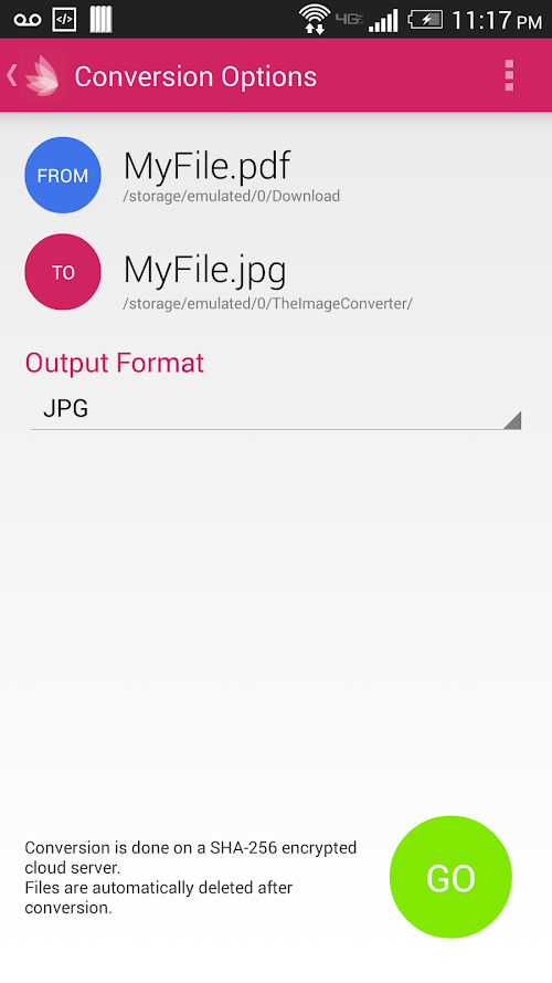 Conversion is done on a secure server, which makes conversion easier and more battery-friendly. You must have an internet connection to use this app. Files are SHA-256 encrypted and immediately deleted from the server upon conversion.