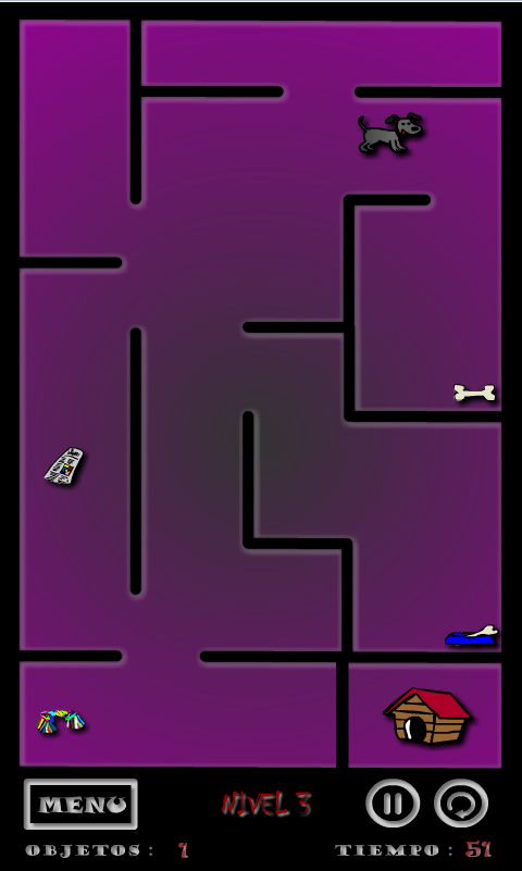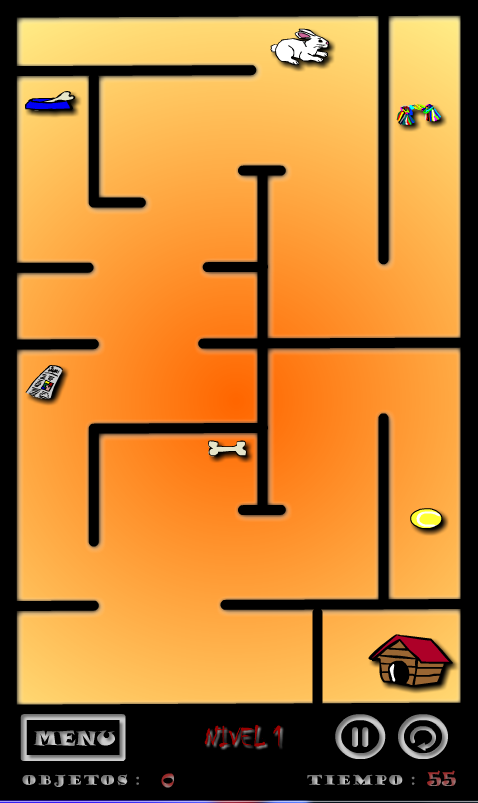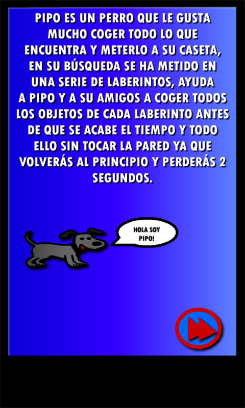 Pipo is a dog that loves to play Pipo helps to go through a series of mazes and go picking your items to put them in your house, help your friends Pipo and Suso, and Dingo Greky carry objects Pipo, bone , the bowl to eat, the toy, a tennis ball or a newspaper to your house before the time runs out, and all this knowing that every time you bump into the wall and you'll lose 2 seconds at the beginning of the maze.