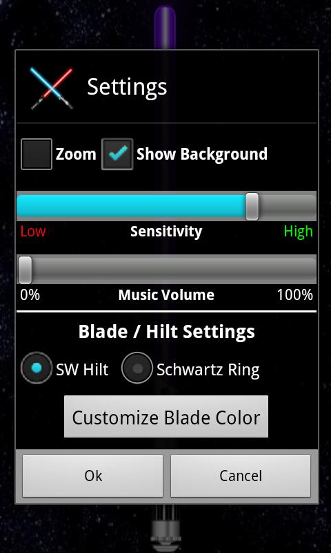 * Menu options include fullscreen view, Adjustable sensitivity, Customization of blade color, and Music Volume