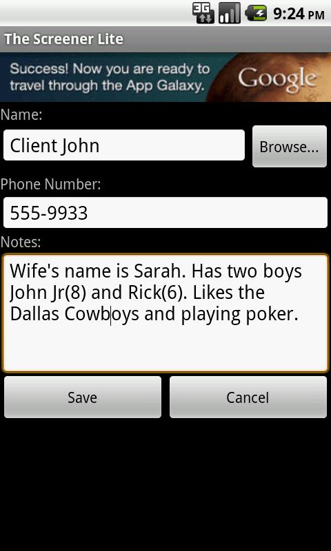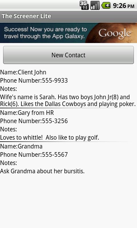 The Screener will notify you when a voice call or text is received from a screened contact. The name and notes associated with that phone number will be displayed so you can quickly read them before answering! This lite version of The Screener allows you to screen three phone numbers. Upgrade to the full version for unlimited screened numbers and the automatic screening of contacts that you've deleted.