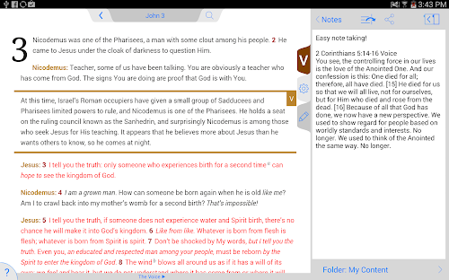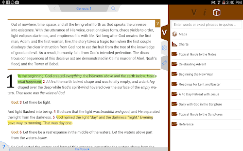 The Voice™ is a faithful dynamic equivalent translation that reads like a story with all the truth and wisdom of God's Word. Through compelling narratives, poetry, and teaching, The Voice invites readers to enter into the whole story of God, enabling them to hear God speaking and to experience His presence in their lives. Through a collaboration of nearly 120 biblical scholars, pastors, writers, musicians, poets, and artists, The Voice recaptures the passion, grit, humor, and beauty that is often lost in the translation process. The result is a retelling of the story of the Bible in a form as fluid as modern literary works yet painstakingly true to the original manuscripts.