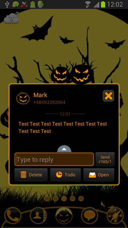 We invite you to Halloween reality with our go sms. You can have very terrible cruel pumpkins on you mobile! Pumpkin is a symbol of Halloween. This day is full of nightmare like witch, ghost and vampire too. It is very scary mystery day. People used to think that in a pumpkin live a soul of the dead. If you want celebrate this day with us just download this and use!