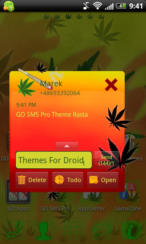 Do you want to texting be more fun? Be sure to change the look of your mailbox. From now on texting will become your passion. If you love the themes presented ganja and weed appearance this go sms pro is for you. By using this them you will be always associate with rasta and the thriving fields of marijuana and ganja grass. Chill out, be with you! Our products will be able to quietly relax in style rasta and enjoy the great looks of your phone and SMS mailbox.