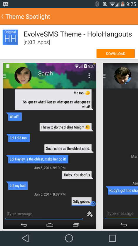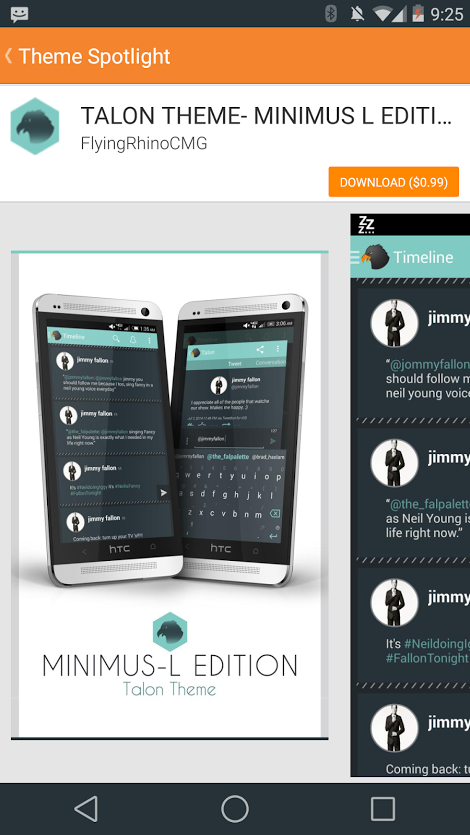 With the Theme Spotlight, you can easily find new and awesome themes for EvolveSMS and Talon for Twitter (Classic) and apply them from within the app! Enjoy browsing through either a list of all themes, narrow your results down by searching, or take a look at the featured themers section to find all of the best themes from your favorite themers!