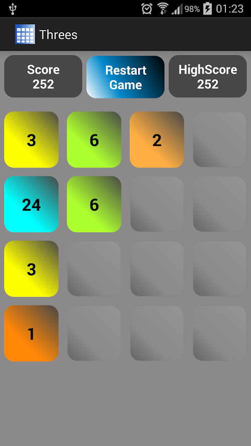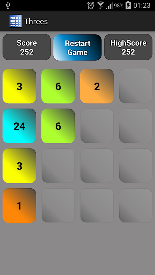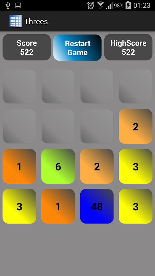 Threes is like 2048 game where you swipe left, right, up or down to move all tiles in that direction. If two adjacent tiles are the same or if they are of value 1 or 2, they combine to make one tile with the total of the two adjacent tiles. Doubles start from Threes and that is the reason it is called Threes. When you move the tiles, it also adds a new tile which is either a '1' or a '2'. Colors are based on the value of the tiles. Colors for different value tiles are distinctable intentionally for it to be easier for the user to play.