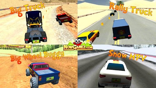 Drive the Championship or Survival mode. Get started in Big Wheel Buggy and win the race to activate a new circuit and a new car. Try to race all the circuits and get your own Big Truck, Rally Truck, Snow MPV or the Nascar! When you unlocked all the cars and circuits you can choose where you want to race the car of your choice. So there is a lot of variety available in this game.