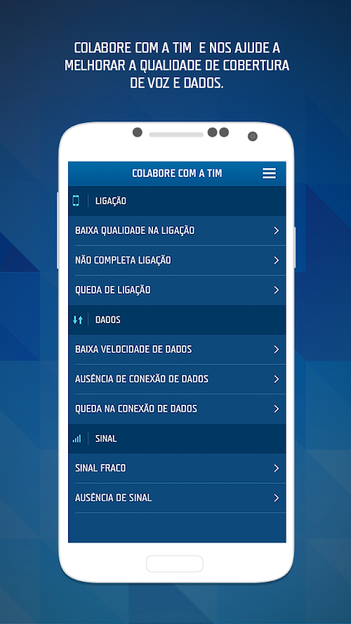 • Colabore com a melhora do serviço na sua região: informe, de forma simples e rápida, qualquer problema na ligação ou na conexão de internet e ajude a melhorar os serviços da TIM. Através de seus reportes, vamos trabalhar para aprimorar nossos serviços cada vez mais.