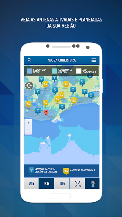 • Visualize a cobertura TIM 2G, 3G e 4G, além da localização das antenas atuais e planejadas.