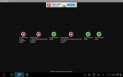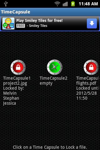 Time Capsules are used to lock a memory to be enjoyed later in time. This app adds this function to your Device. Your files can be locked either by a timer, to open on a specific time, or by passwords. Up to 3 passwords are supported. So a Time Capsule, containing your files, may depend on 3 persons to unlock.