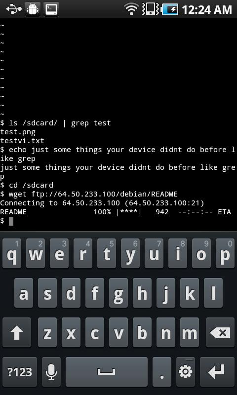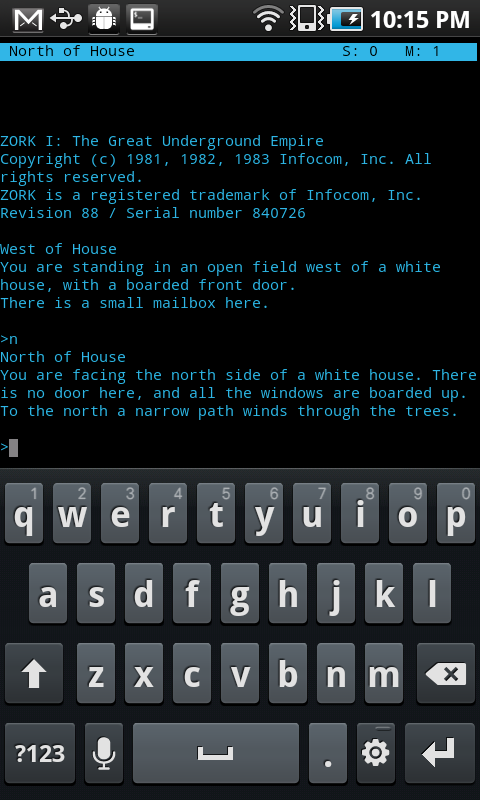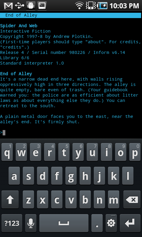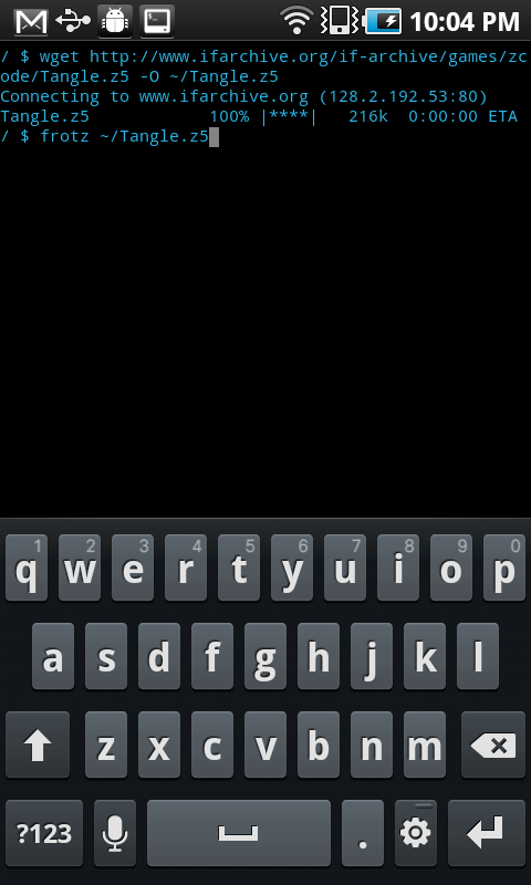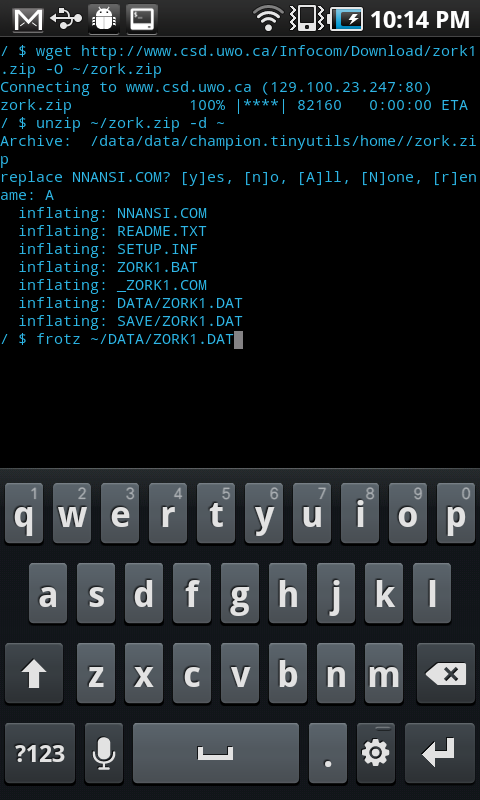 Tiny Utils is not all business though as it now has frotz which allows you to play z-code games. See the screen shots of examples of downloading and playing a couple of popular games (Zork and Spider and Web). Given how nice the Android Terminal Emulator is, I think this might be the best environment for playing z code games.