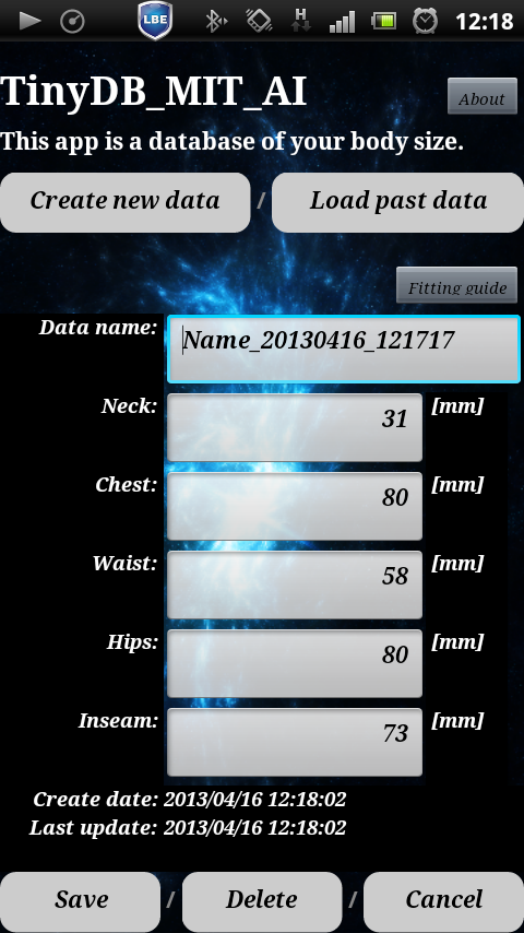 今回、TinyDBの利用例として、ボディーサイズ情報を記録したり、編集したりするアプリを製造してみました。ご自分のみならず、ご家族みんなのサイズ情報を記録しておけば、お買いものの際にご活用頂けるかもしれません。