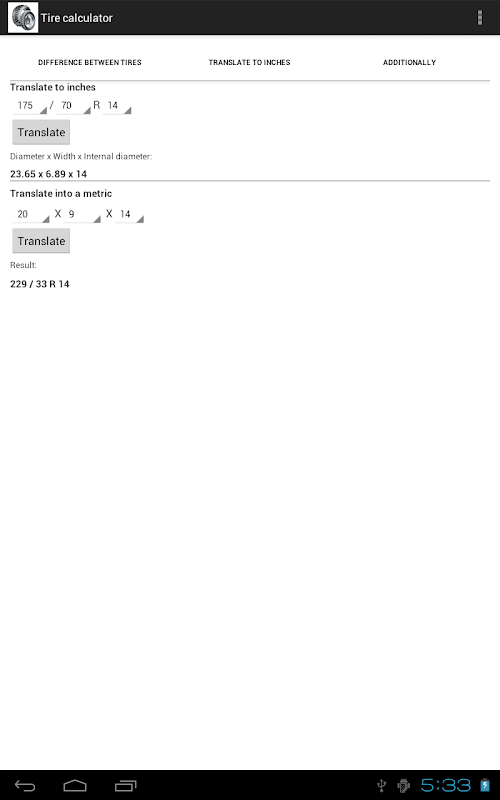 2. Translate tire sizes in inches, or from inches to metric parameters.