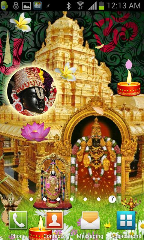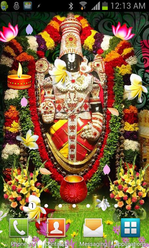 This is a beautiful high quality live wallpaper of Tirupati Balaji, also known as Venkateshwar, Govinda and Srinivasa. It features Lord Balaji and Tirumala Venkateswara Temple with shower of animated flowers, diya and leaves.