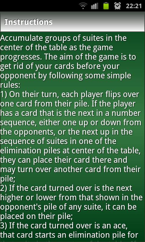 Accumulate groups of suites in the center of the table as the game progresses. The aim of the game is to get rid of your cards before your opponent by following some simple rules: