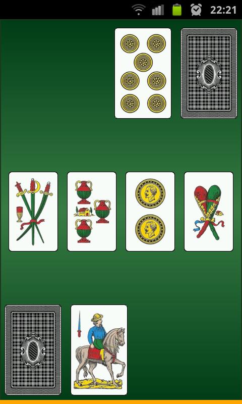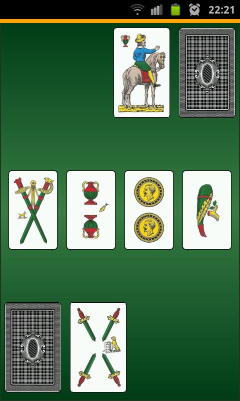 To play, you need 40 cards, 10 each of four suits: cups, coins, swords and clubs. The cards' value is the number of the suite objects shown on the card, or for the face cards: the woman has the value of 8; the horseman has a value of 9; and the king has a value of 10. Tivitti is a two player game, each player starting with 20 shuffled cards.