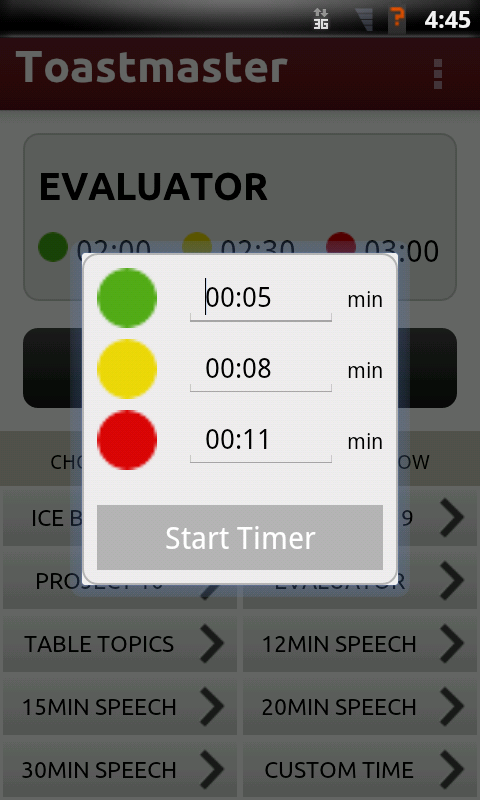Toastmasters Speech Timer totally simplifies the task. While it's as easy to use as a stopwatch, it does a lot more. During a speach, when it's time to show the green, yellow or red light to a speaker, the app causes screen to rapidly blink. The blinking screen is very noticeable. So you can just enjoy the speech and no more constant shuffling your gaze from the speaker to the stopwatch! You'll know when it's time to signal the speaker!