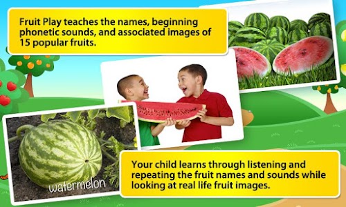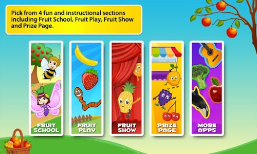 This app features 4 instructional sections including Fruit School, Fruit Play, Fruit Show and Prize Page.