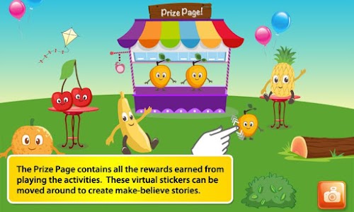 Prize Page: The Prize Page contains all the rewards the child has earned from playing the Fruit Play activities. These virtual stickers can be moved around to create make-believe stories. Capture some of your favorite scenes to your photos folder so you can revisit the story later!