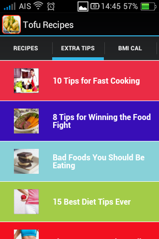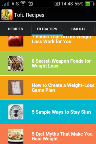 This application will shows the information about tofu recipes,weight loss tips ,BMI Cal and healthy diet. If you want to good health,this application can help you.