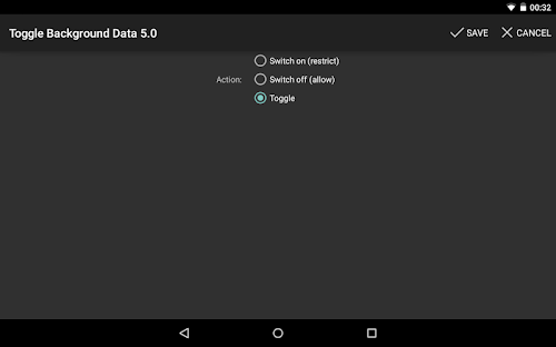 Please note: This app does not control the cellular data state. It only controls the background data restriction.
