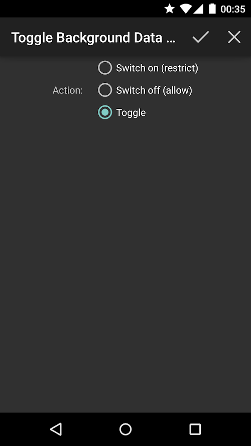 The first and only widget to toggle background data (called "Data Saver" on Android 7) on Android™ 5.0/5.1/6.0/7.0/7.1! With Locale/Tasker support!
