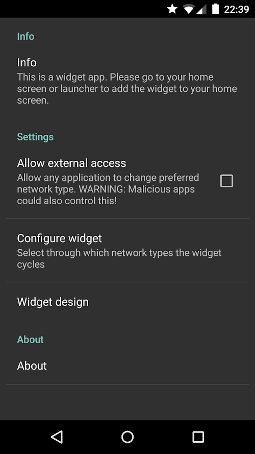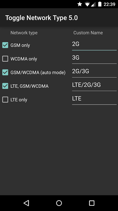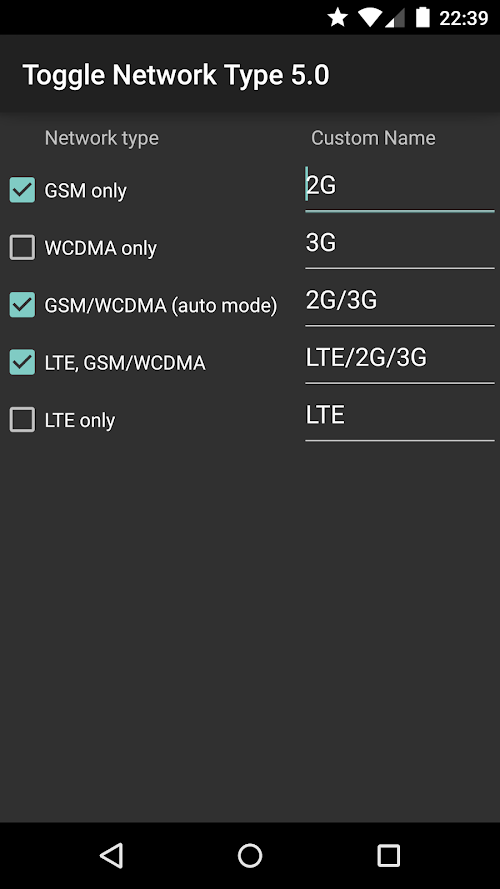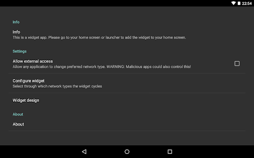 Easily toggle your preferred network type with this widget. Select from all available types via the settings, e.g. 2G, 3G, LTE, 2G/3G, etc., and cycle through them by clicking on this widget. Works on Android™ 7.0/7.1 (Nougat), Android 6.0 (Marshmallow), and Android 5.0/5.1 (Lollipop).