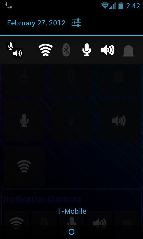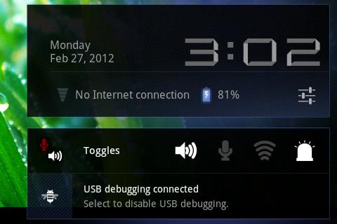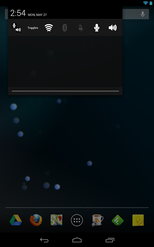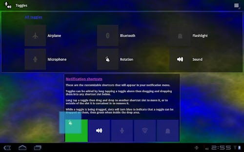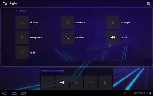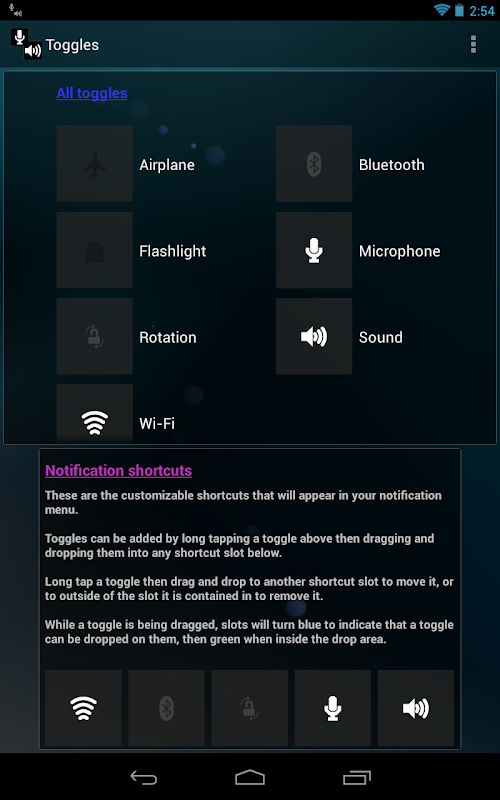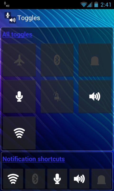Toggles allows you to quickly enable or disable key functions on your device. In addition to the main activity where any setting can be turned on or off, up to five toggle shortcuts can be placed on the notification menu providing easy access to toggles you use regularly from any home screen or while in another app. Currently included toggles are: airplane mode (through Android 4.1), Bluetooth, LED flashlight, microphone, rotation (orientation) lock, sound, and Wi-Fi.