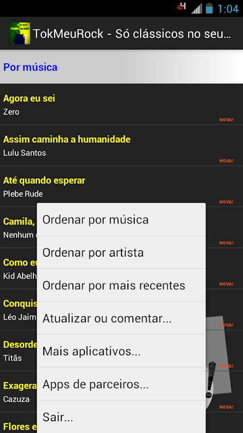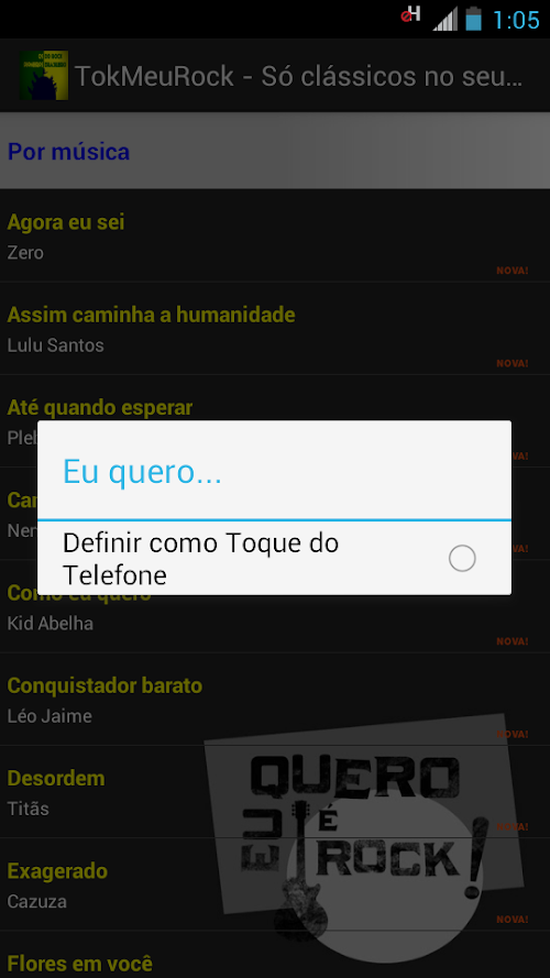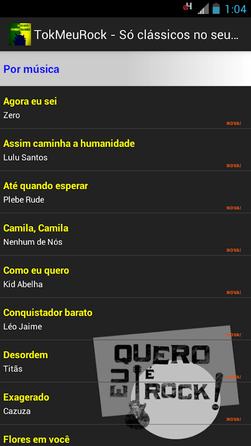 Observação: O aplicativo é gratuito e tem como objetivo divulgar o trabalho de diversos artistas no Brasil e no exterior, sem quaisquer compromissos. Apenas trechos de músicas (máx. 10s) são disponibilizados, não as músicas completas. Para ouvir músicas completas, acesse sites do gênero. Prestigie os artistas comprando CDs, DVDs e indo aos shows! TokMeuRock is the application that only puts classics of Brazilian rock on your mobile! are 135 EXCERPTS of pop-rock songs that you can put as your mobile ringtone or just listen to them when you want! Show your friends and family! We added new music often!