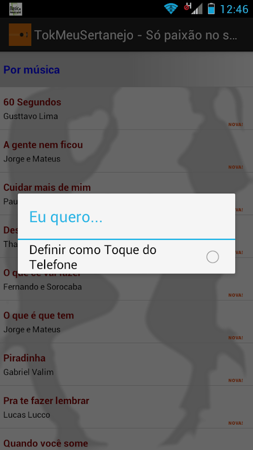 Observação: O aplicativo é gratuito e tem como objetivo divulgar o trabalho de diversos artistas no Brasil e no exterior, sem quaisquer compromissos. Apenas trechos de músicas (máx. 10s) são disponibilizados, não as músicas completas. Para ouvir músicas completas, acesse sites do gênero. Prestigie os artistas comprando CDs, DVDs e indo aos shows! TokMeuSertanejo is the application that only puts enthralling music on your phone! are 148 EXCERPTS of country songs (including university sertanejos) you can put as your mobile ringtone or simply hear them whenever you want! Show your friends and family! We added new music often!