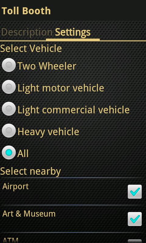 Next screen will display the cost for each plaza for Cars/Jeep, Trucks/Bus and Motorbikes. The settings screen lets you to choose vehicle type for getting toll rates.