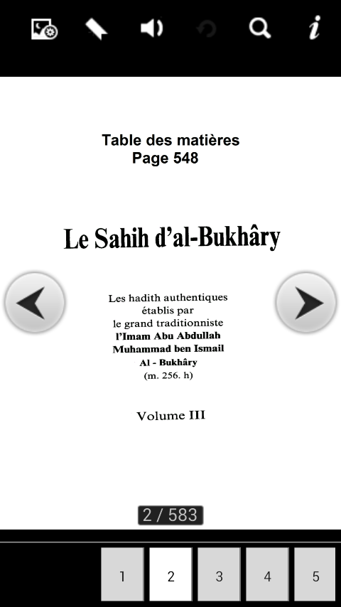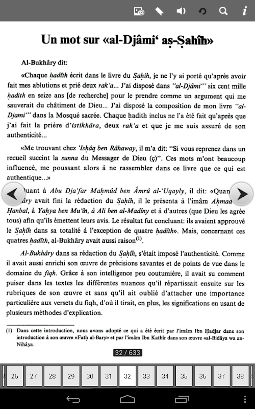 Le Sahîh d’al-Boukhârî fut le premier recueil de hadîth composé avec une rigueur extrème et soumis à des critères d’authentification poussés. Il est reconnu valide à l’unanimité des doctrines et tendances musulmanes et constitue la première source de la Sounna du Prophète (bénédiction et salut de Dieu sur lui).Sahih Bukhari Volume 3, French and Arabic