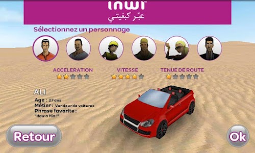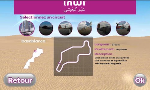 Pour participer au Tomobile Racing, vous pouvez jouer en solo ou en multi-joueurs. 3 modes sont proposés pour chaque type de jeu : Grand prix, Course simple et Contre la montre. Les 3 modes sont assortis de 3 niveaux : Facile, Normal, Expert. Sur chaque circuit, des bonus vous permetteront d’améliorer votre score.Tomobile Racing is the first racing game car in true 3D, offering exclusively Moroccan circuits representing six cities of the Kingdom: Casablanca, Rabat, Marrakech, Essaouira, Ouarzazate and Tangier. The total number of cars in competition is 6 and each car has a character with distinct features.