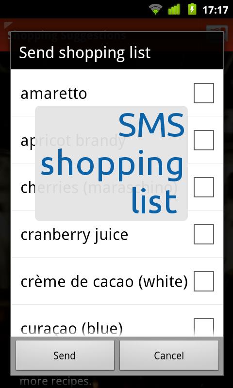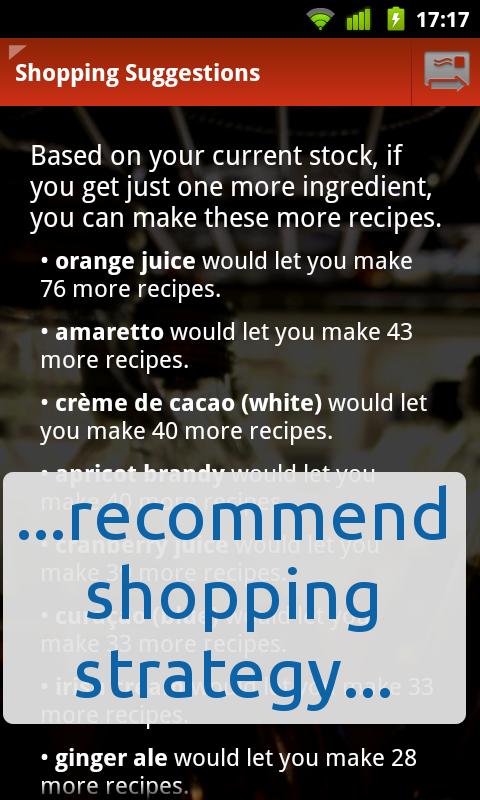 Become an expert mixologist at your own pace with the shopping suggestions. For example, "If you get cream, you can make 50 more recipes!" and "Your favorites need triple-sec, which you don't have." Send shopping lists via SMS, Twitter, email, or QR.