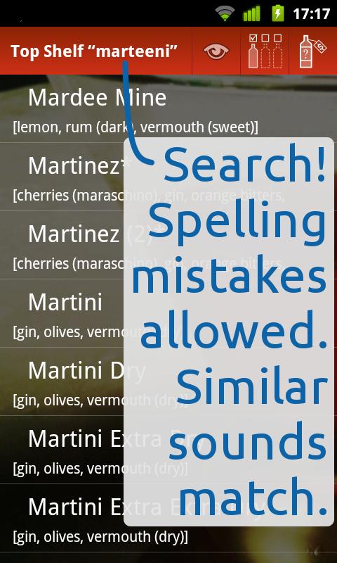 Search recipes by ingredients or by name. Misspellings allowed, similar-sounding names supported, and voice search enabled, for when *you* are the one drinking cocktails!