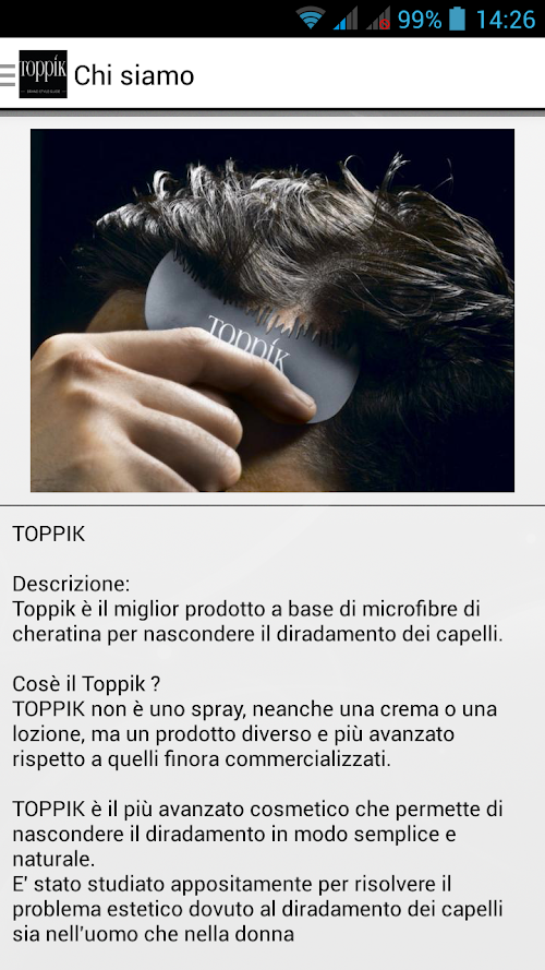 Toppik rende la capigliatura più folta e più piena in pochi istanti. Le Toppik Hair Building Fibers sono fibre di cheratina di altissimo livello, la stessa proteina organica dei capelli. Le fibre hanno una carica statica naturale molto forte che crea un effetto magnetico unendo le Toppik Hair Building Fibers persino ai capelli più fini. I risultati hanno cambiato la vita di milioni di donne e di uomini in svariate situazioni, che vanno da capelli fini ad aree soggette a diradamento fino all’alopecia.Toppik makes the hair thicker and fuller in seconds. The Toppik Hair Building Fibers are keratin fibers at the highest level, the same organic protein hair. The fibers have a very strong natural static charge that creates a magnetic joining Toppik Hair Building Fibers even the finest hair. The results have changed the lives of millions of women and men in a variety of situations, ranging from fine hair thinning in areas facing up to alopecia.