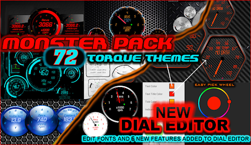 72 Gauges and Dials for Torque Lite and Pro with Backgrounds to match. Brand new editor! You can Now Change the Font on your Dial, with 6 other new features only in 72 pack. Millions of Color Combinations. For Torque Pro or Torque Lite.