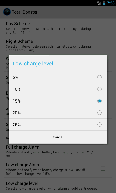 ☆ Low Battery Alarm : Vibrate and notify when battery is low. Options available to set your preferred low level (5%, 10%, 15%, 20%, 25%).