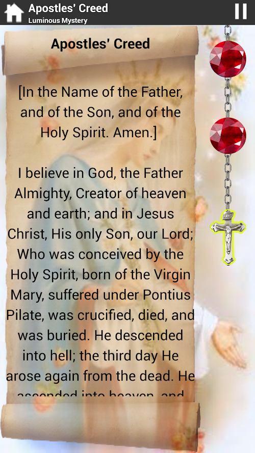 Note: To support the continual development of this application, a small ad is displayed on the bottom of the home screen. However no ad is displayed on the Rosary screen itself so as not to interfere with your prayers.