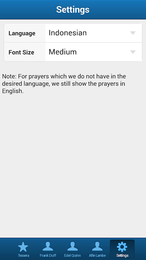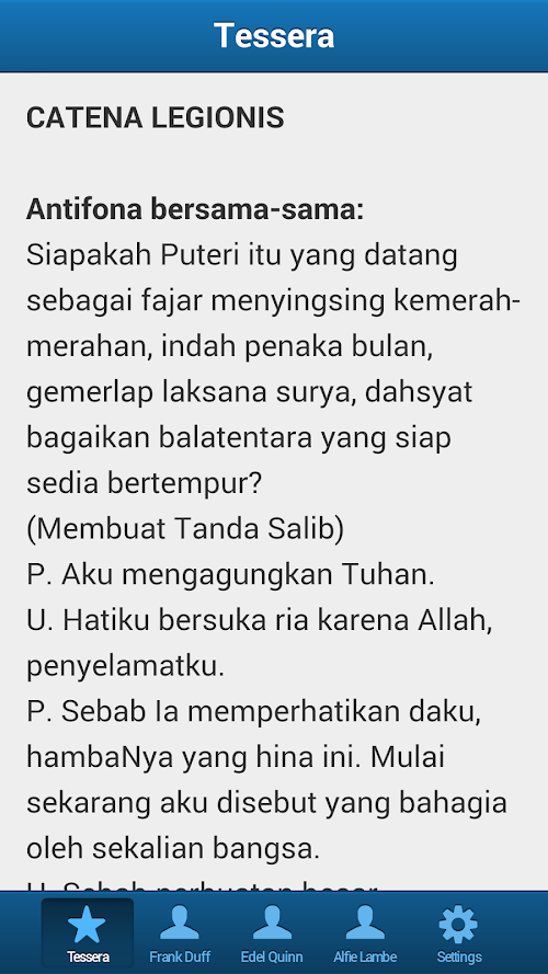 Touch Tessera application contains common Legion prayers, such as Tessera and Legion intercession prayers. This application can help you to pray Legion prayers anytime anywhere with your mobile devices.