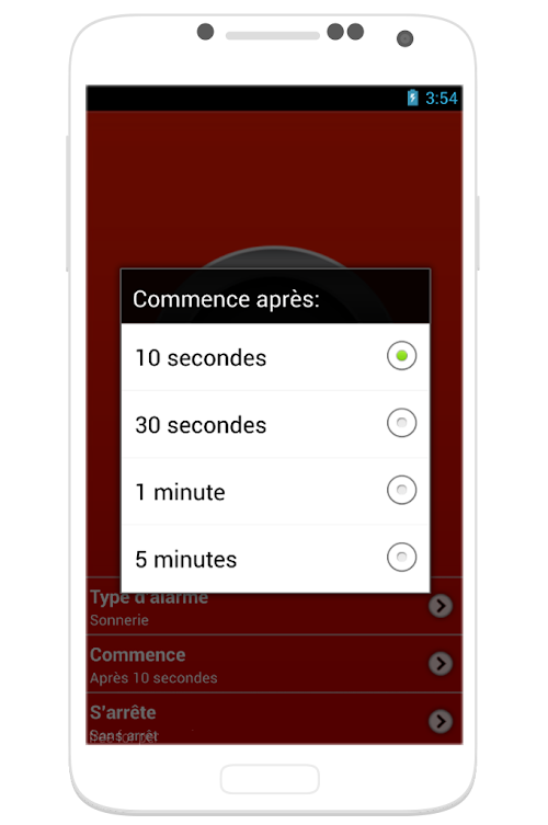Vous pouvez choisir le moment de l'activation de l'alarme (par exemple 10 secondes après que vous verrouillez le téléphone)