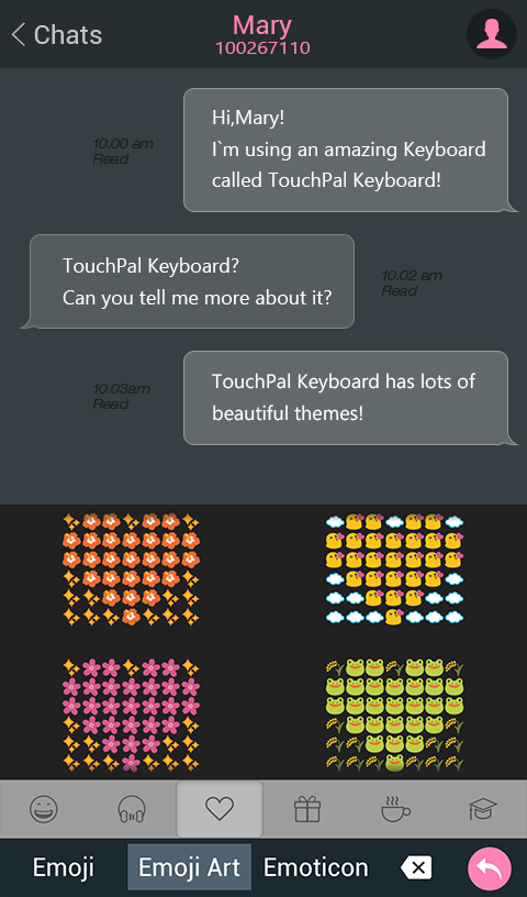 -Install the Droid L Pink Keyboard theme ---> Press its icon ---> It would be enabled by TouchPal Emoji Keyboard automatically!