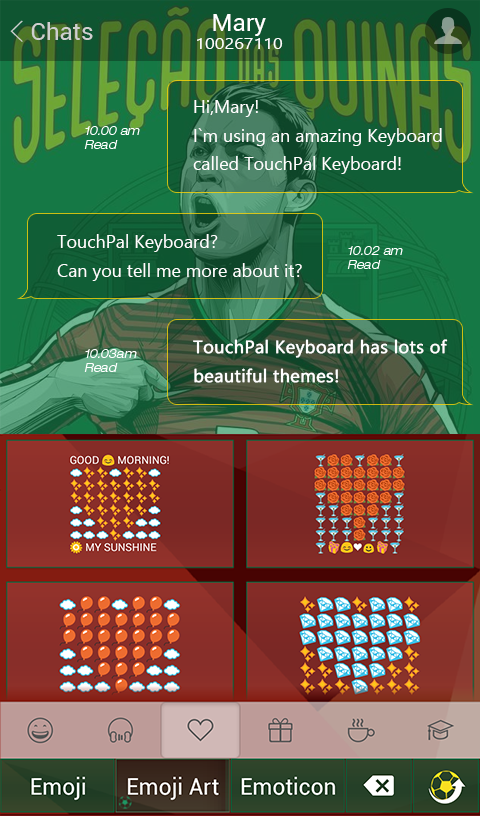 -To activate the Portugal_FIFA TouchPal Keyboard theme for Droid L, you need TouchPal - Free Emoji Keyboard 5.4.6.1 or above, which is chosen by over 300 million people worldwide.