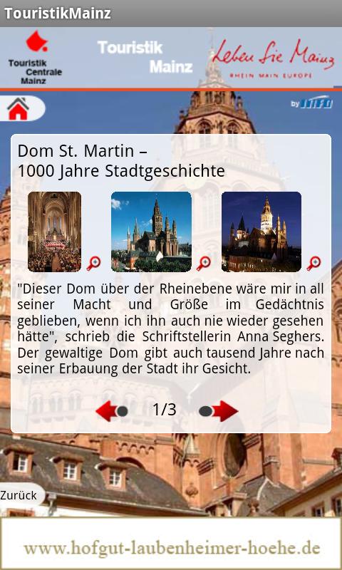 Touristik Mainz bietet Informationen über das touristische Angebot der Landeshauptstadt Mainz. Sie finden hier Sehenswürdigkeiten, kulturelle Angebote, Einkaufsmöglichkeiten und typisch regionale Angebote über Fastnacht, Wein, ZDF, Museen, Kirchen und vieles mehr.