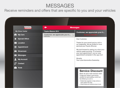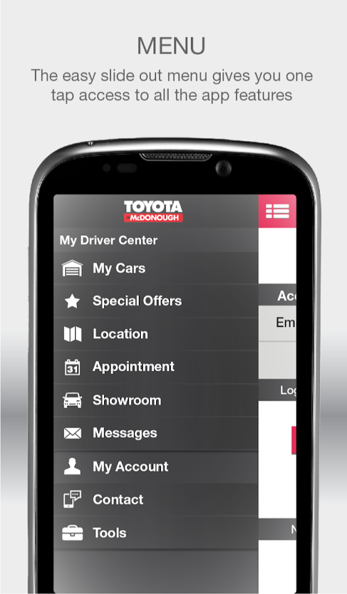 Make your vehicle ownership experience easy with the free Toyota of McDonough mobile app. This feature-rich app allows you to get the most out of your vehicle by helping you to maintain and organize essential car details like service history, as well as save money with mobile offers and coupons!