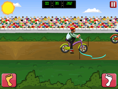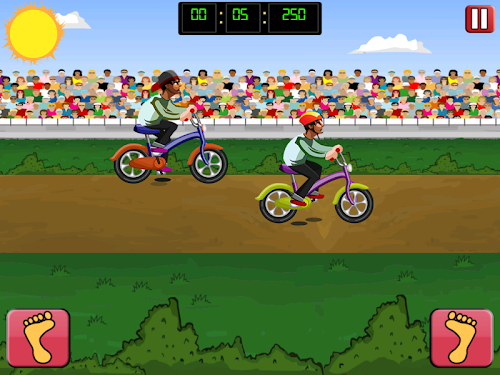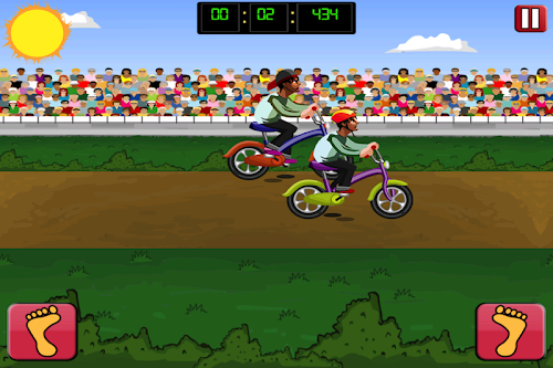 Two guys pretending to be at the masters world games bike racing except they are on kids bikes. Loads of fun to play and quite addicitve. Looks simple yet it is hard to win. You have to get you fingers going just right to get the speed needed to win.