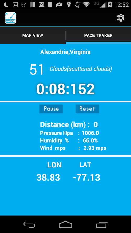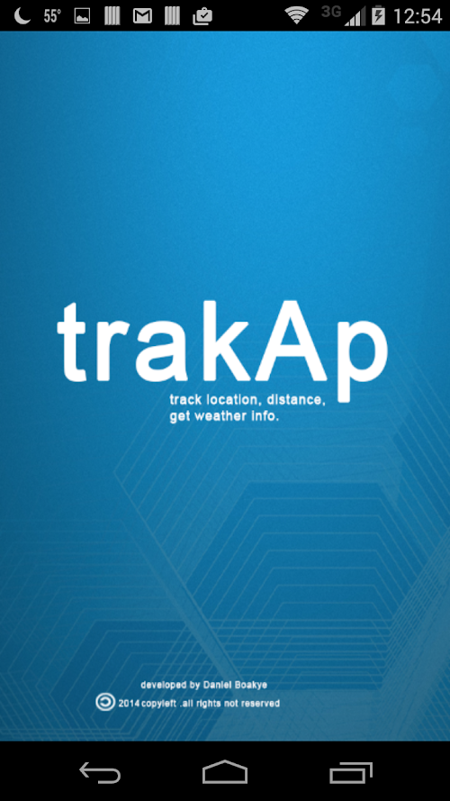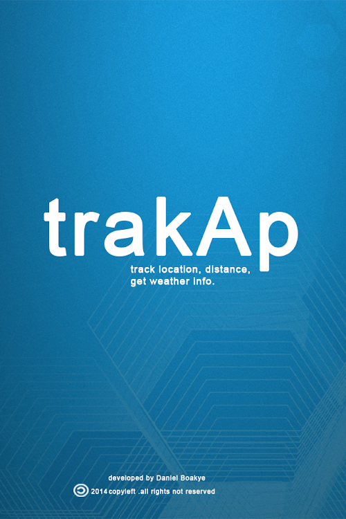TrackAp is an application , used in tracking distance traveled, and time between two activities. The app also provides useful information such as weather, longitude ad latitude, air pressure and humidity. Ideal for walking, driving and cycling.