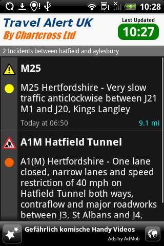 Data is read from the Highways Agency and Traffic Scotland traffic feeds and stored locally in a database for instant access, so even if you have not got a data connection, you will see the traffic details from your last update.